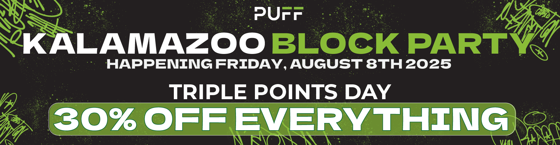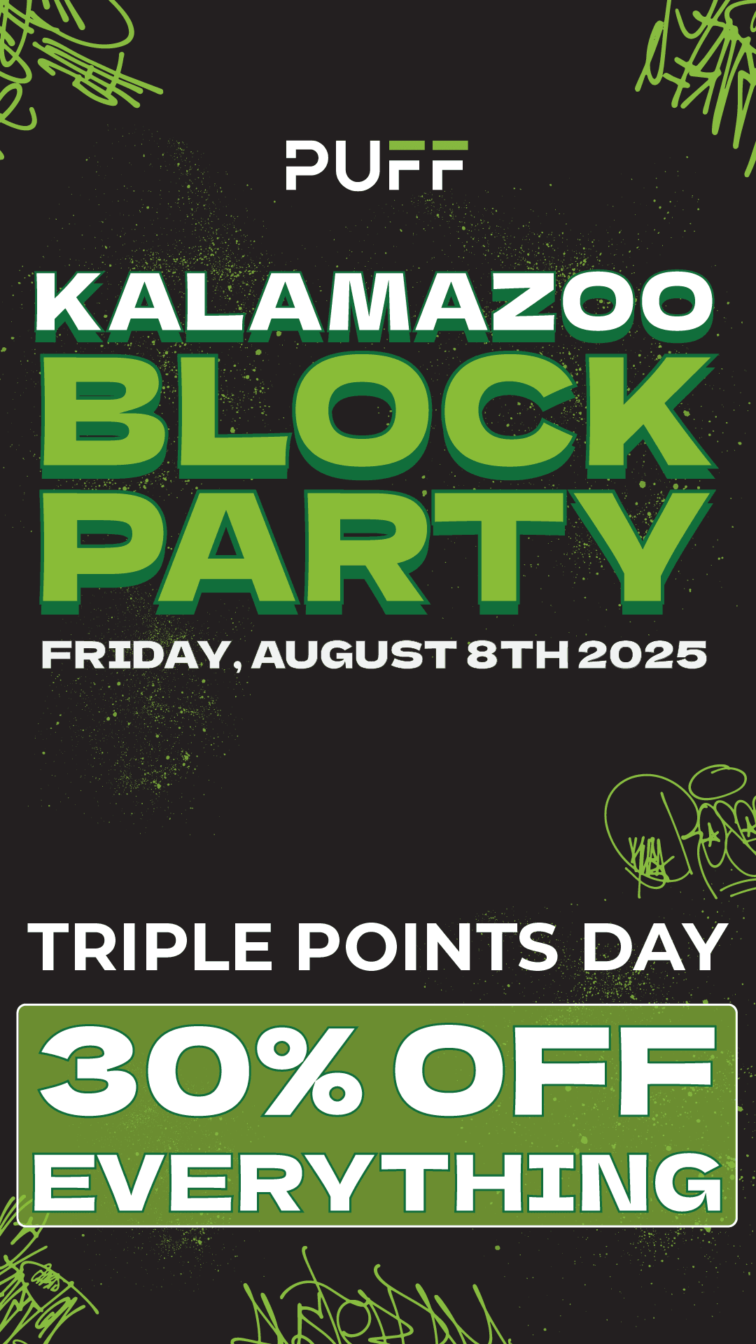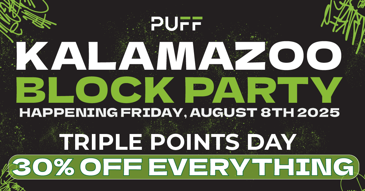 Come join us at PUFF Kalamazoo for our Block Party Summer event this Friday August 8th 2025! To show our appreciation, we will be featuring crazy deals, top vendors and triple points day for all reward members!
