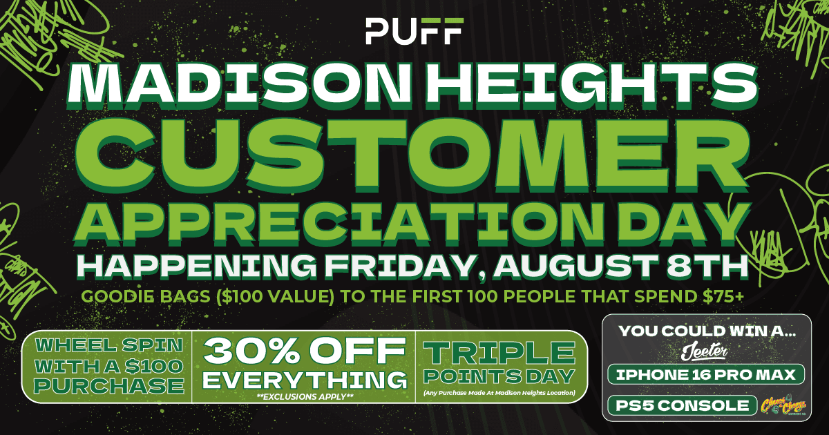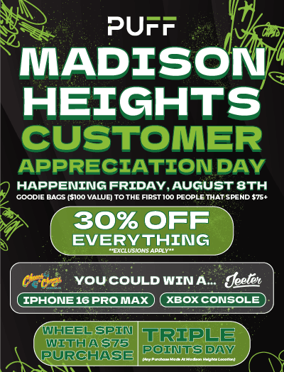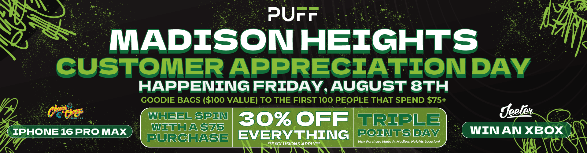 Come join us at PUFF Madison Heights for our Customer Appreciation Summer event this Friday August 8th 2025 with a chance to win a XBOX and an Iphone 16 Pro Max 512GB for our in store giveaway! To show our appreciation, we will be featuring crazy deals, top vendors and triple points day for all reward members!