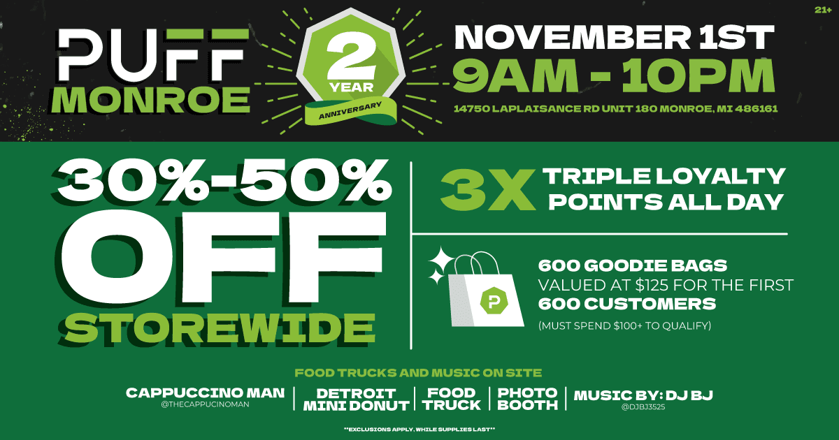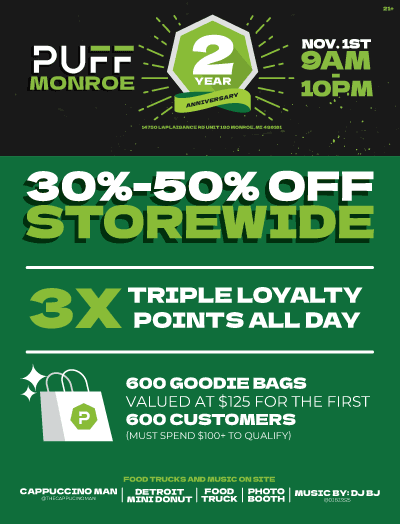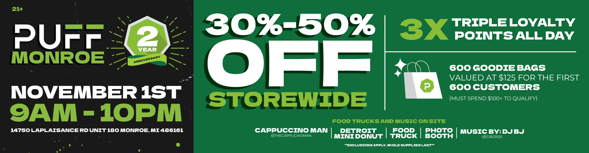 Come join us at PUFF Monroe to help celebrate our 2nd year anniversary this Saturday, November 1st 2025 for 30%-50% OFF EVERYTHING and FREE GOODIE BAGS ($125 VALUE) TO FIRST 600 CUSTOMERS WITH A $100+ PURCHASE! To show our appreciation, we will be featuring crazy deals, top vendors, and triple points day for all reward members!