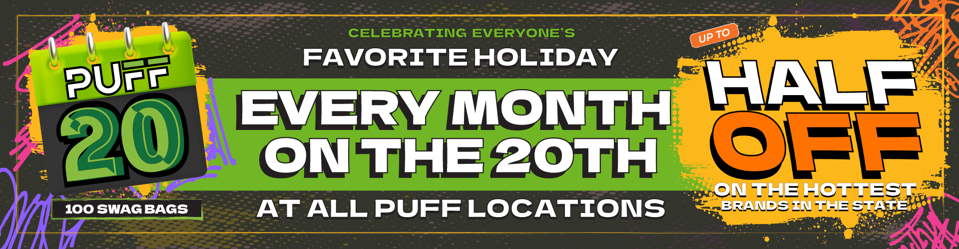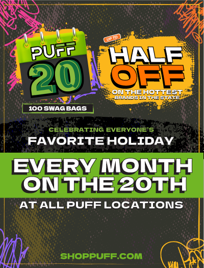 Puff’s customer appreciation day events just got a major upgrade that has never been seen before in the industry! All PUFF locations will now all be doing the same event, on the same day of every month! This will be called PUFF20 and will be held on the 20th of every month! Get up to 50% off on your favorite brands at any puff location on the 20th of every month, all year long!