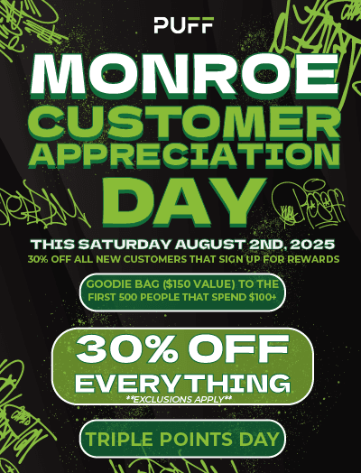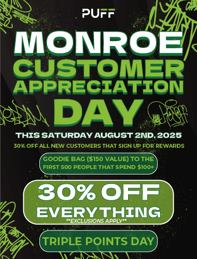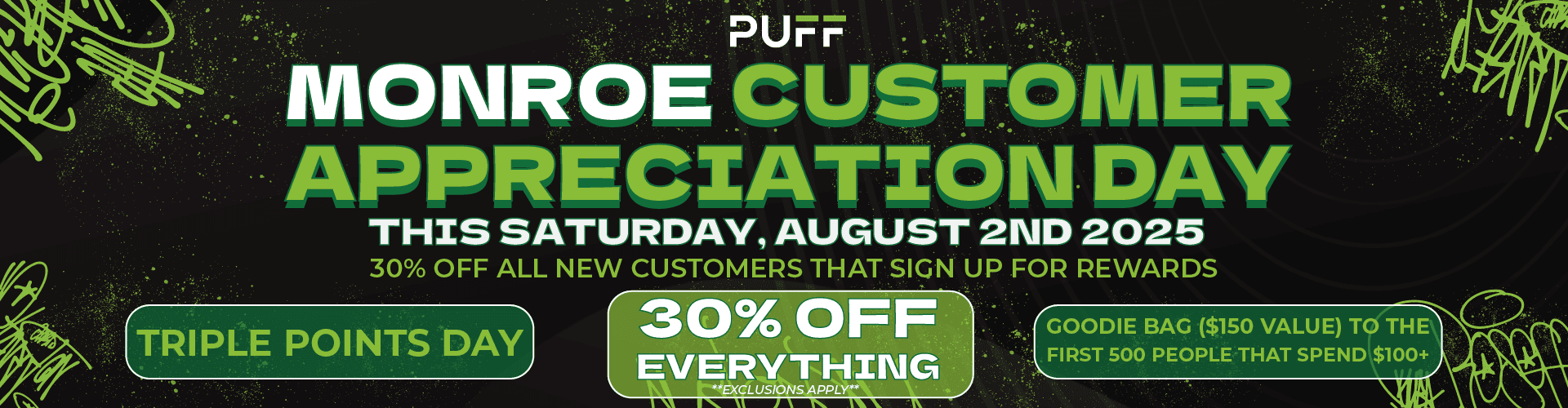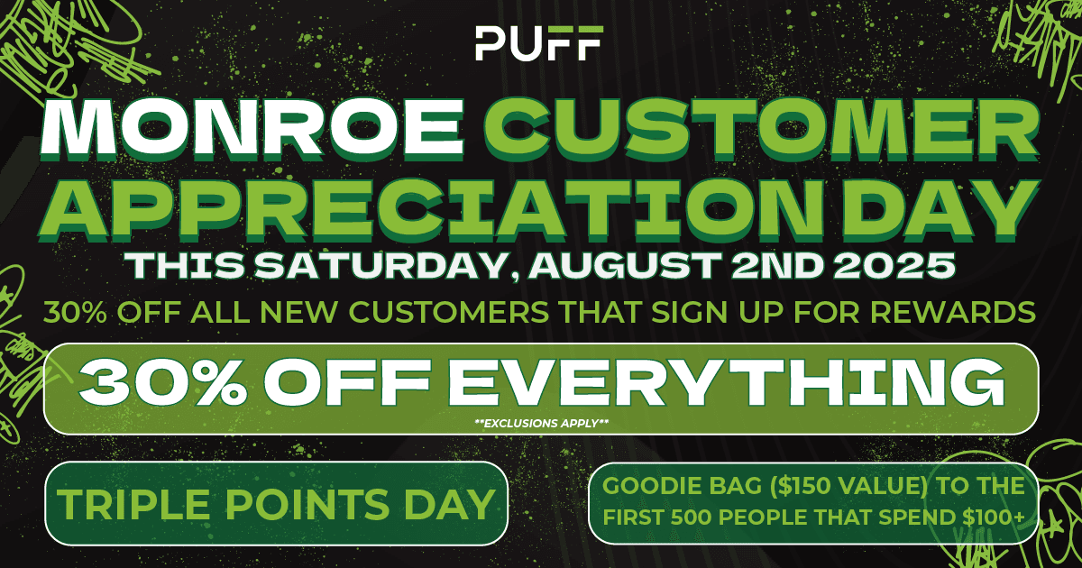 Come join us at PUFF Monroe for our Customer Appreciation Day Event this Saturday Aug 2nd 2025. To show our appreciation, we will be featuring crazy deals, top vendors and triple points day for all reward members!