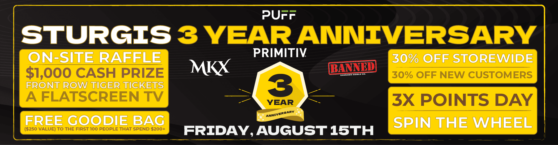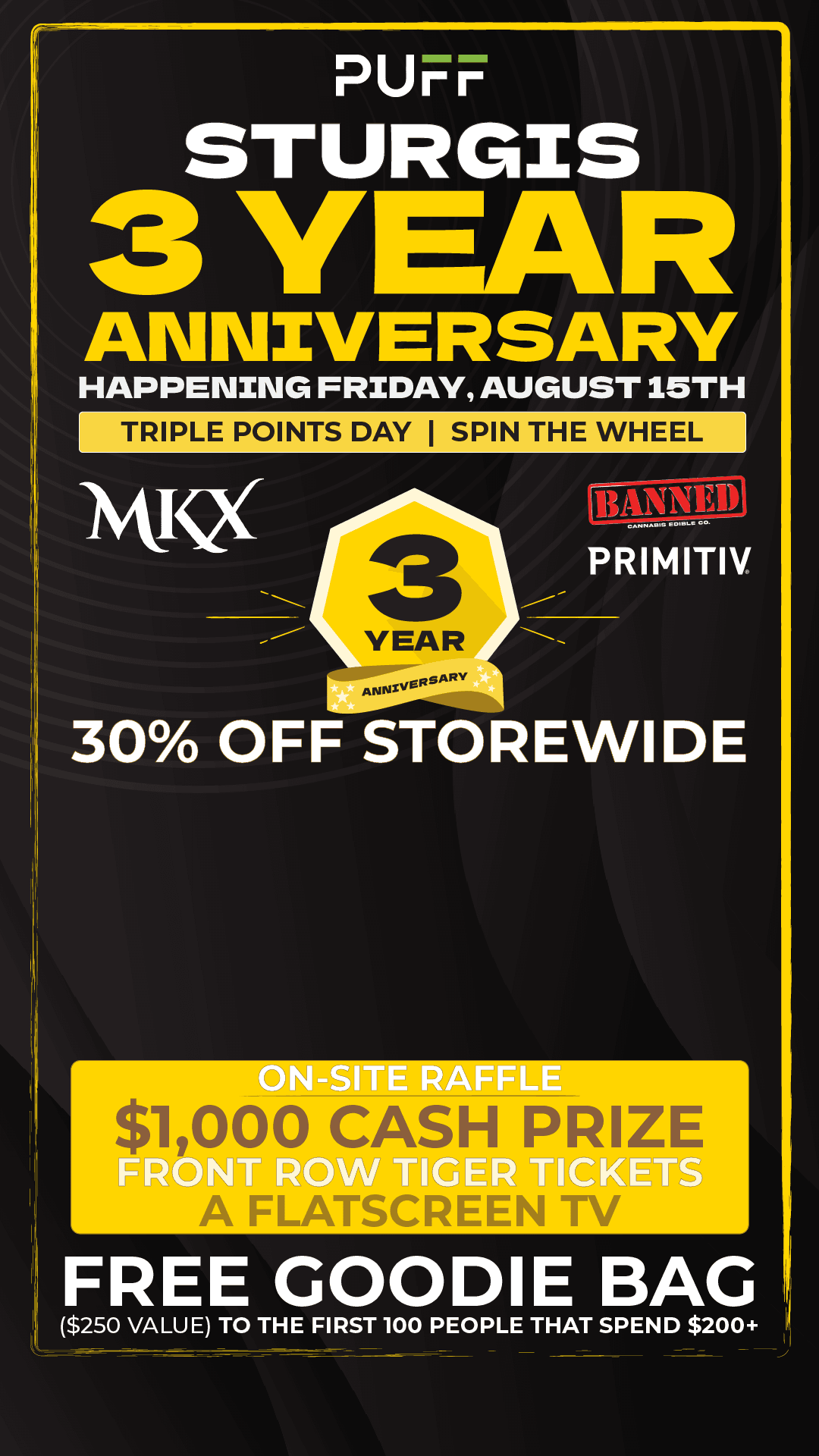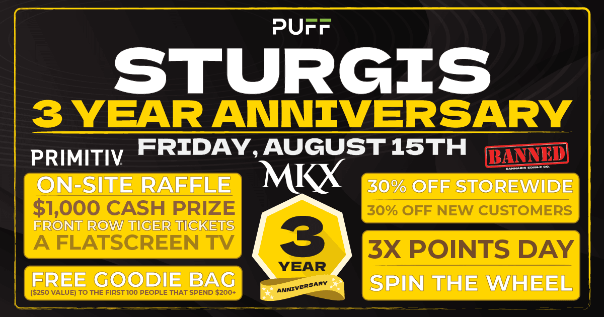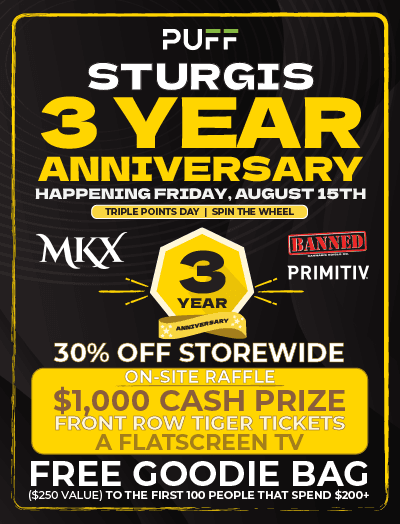 Come join us at PUFF Sturgis  to help celebrate our 3 year anniversary this Friday Aug 15 2025 for 30% OFF EVERYTHING and IN STORE GIVEAWAYS! To show our appreciation, we will be featuring crazy deals, top vendors and triple points day for all reward members and In-Store Giveaways that include  $1000 Cash Prize (Primitiv), Front Row Detroit Tigers Tickets (Banned), Flatscreen TV (MKX).
