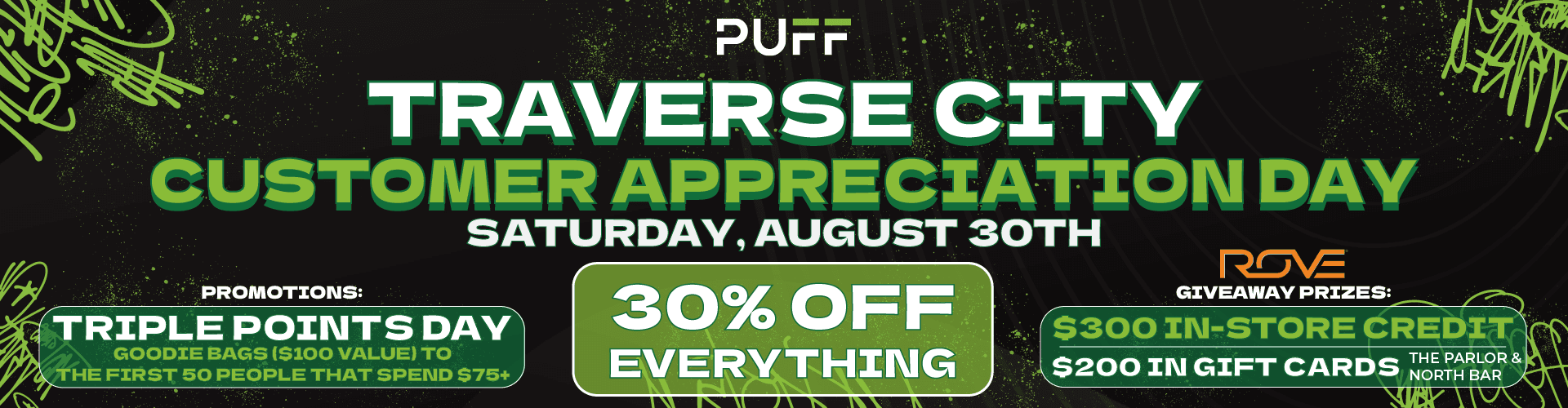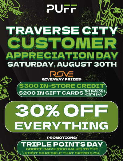 Come check out the PUFF Traverse City event this Saturday August 30th 2025 for our Customer Appreciation Day, where we will be featuring crazy deals, top vendors and triple points day for all reward members! You will have a chance to win $200 inGift Cards (The Parlor and North Bar) and $300 In store credit for our in store giveaway!