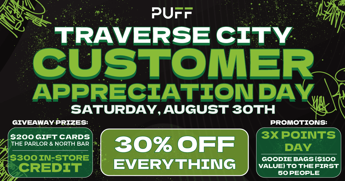 Come check out the PUFF Traverse City event this Saturday August 30th 2025 for our Customer Appreciation Day, where we will be featuring crazy deals, top vendors and triple points day for all reward members! You will have a chance to win $200 inGift Cards (The Parlor and North Bar) and $300 In store credit for our in store giveaway!